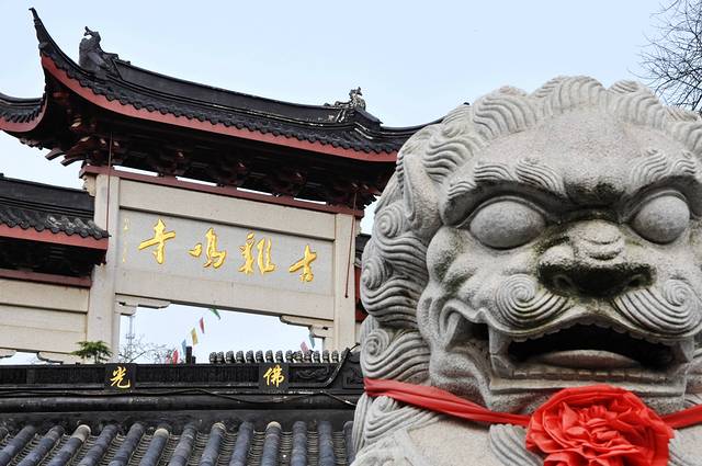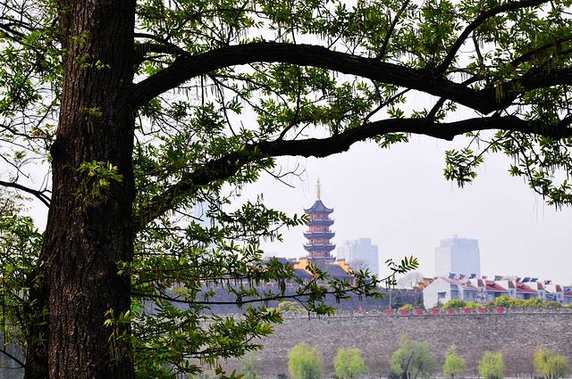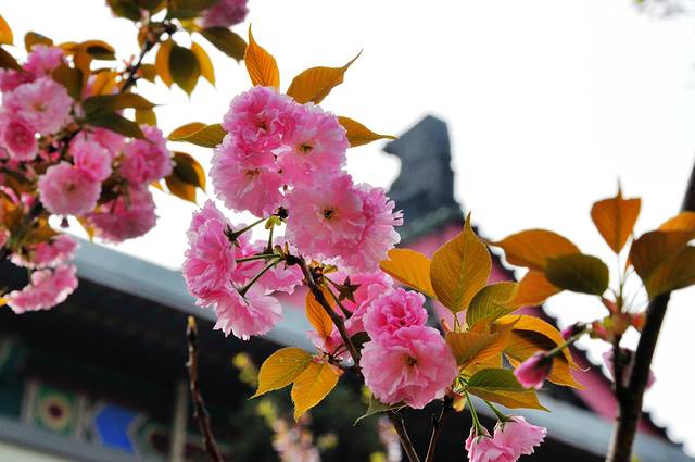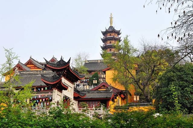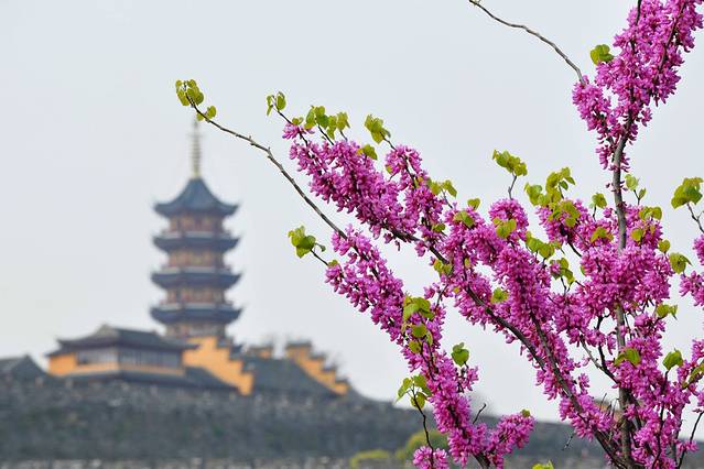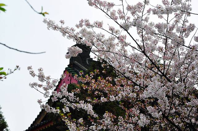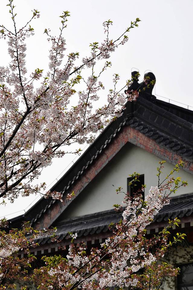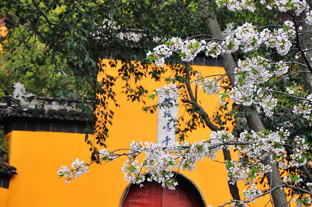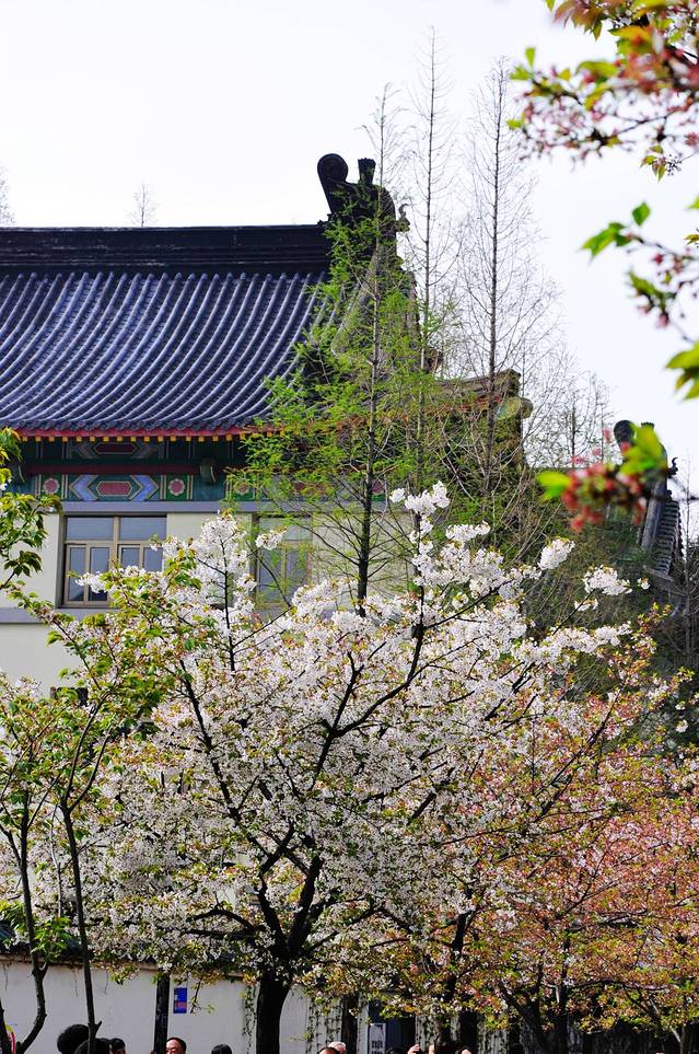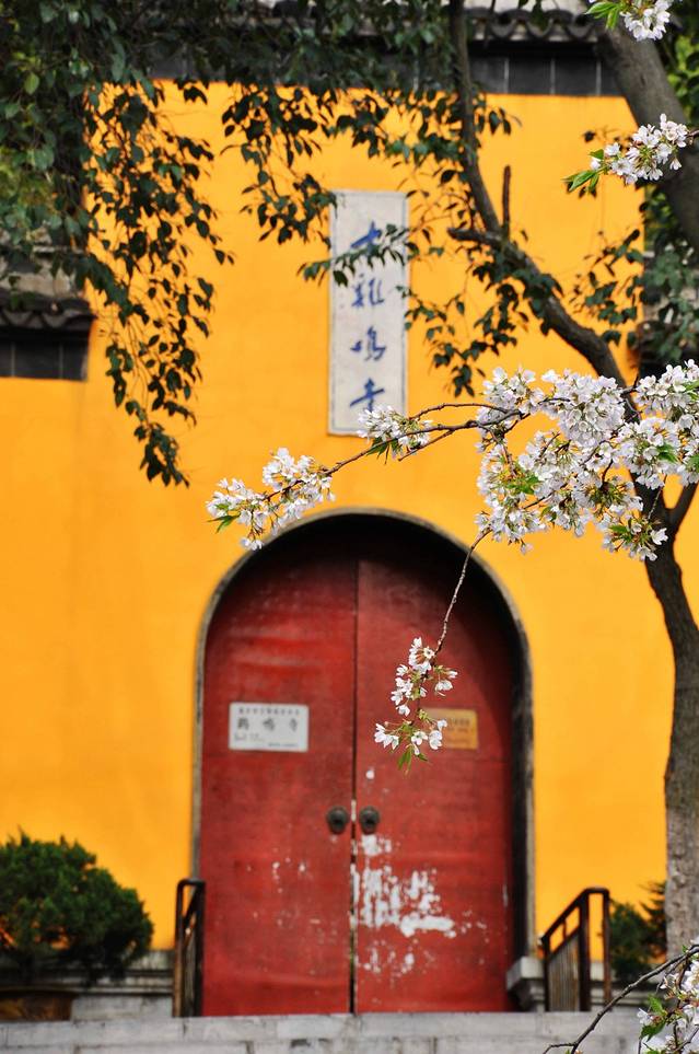 我们沿路前行,一座古寺跃然眼前,小山丘上层次错落的黄墙黛瓦衬托着顶端的一座斗拱重檐佛塔。走到古寺侧面,多重石阶上一座山门,上书“古鸡鸣寺”。山门对面的路边恰巧有几树樱花开得正旺,吸引了许多游人驻足拍照,古寺和樱花前后映衬,黄墙黛瓦和绿树银花相互融合,寺花人相得益彰,景境情春意盎然。