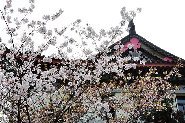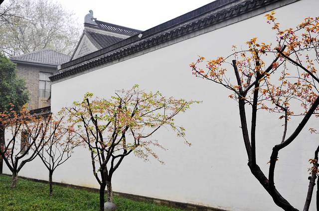第二天,果然是晴空万里,我们在旅馆吃罢早餐退房后,洋溢着依旧晴朗的心情步行迎春赏花。走过北极阁的一小段山路,大概15分钟我们就来到了鸡鸣寺路。遗憾的是我们来晚了,由于今年气温偏高,又刚刚下过一场雨,错过了“樱花七日”的盛开期,无缘欣赏到银花满树,双龙盘寺的盛景。但路旁一座座中西结合的古建筑在一树树花影摇曳的衬托下,仍令人兴奋不已。