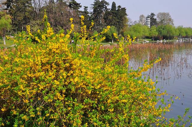 继续前行,一座巍峨的古城墙拦在面前,我知道这是南京的明城垣,后面应该就是玄武湖了。穿过解放门,眼前果然一池静水,豁然开阔。岸边一座长长的堤桥延伸到湖中心的小岛,桥头一簇簇金黄和红镶金边的郁金香,象一张张笑脸迎接着八方游人的到来。按导游图索骥,玄武湖分作“环 、樱 、菱 、梁 、翠 ”五洲,四面环水,处处有山,堤桥相通,浑然一体。步入长桥,似西湖苏堤,绿树茵茵,花团锦簇,远山上古塔耸立,近水处龙舟离弦。