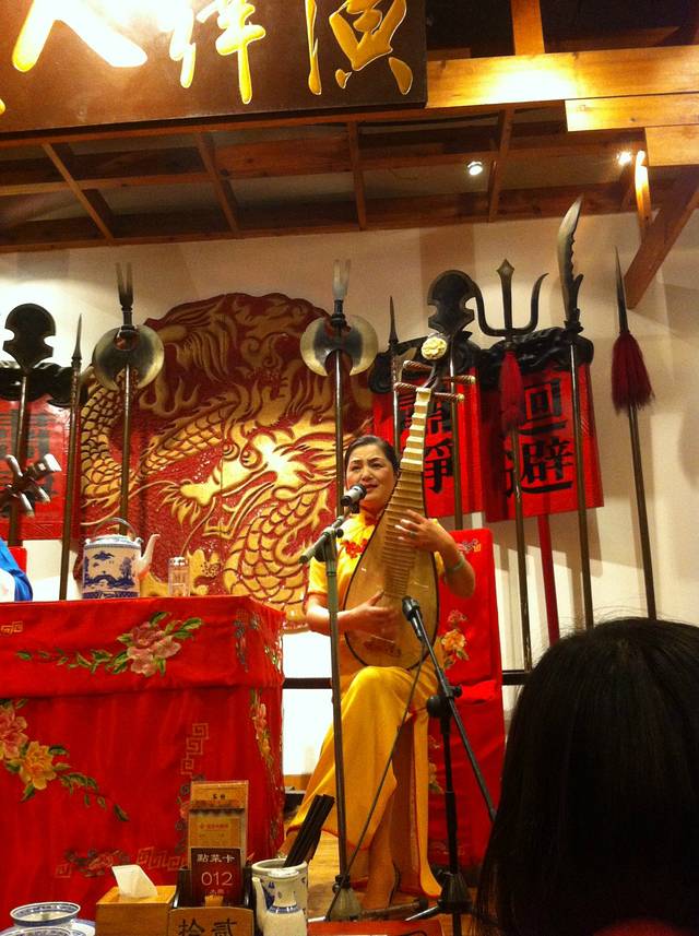 边吃边聊的同时,我也在品味大排档本身的韵味,环境布置像是清末民初的酒楼茶馆、街巷市井,数百种民厨小食共处一室,几十间江南小阁环绕四周,随处可见书写着招牌菜名的楹联灯幌、穿梭于桌台间的古装堂倌。我们桌前的小舞台,19:30两人登台唱上几曲评弹,虽然我这个北方人没听懂唱词,但气韵古雅,置身其中,恍如隔世。老同学一家的热情也像这家酒楼一样,令我们感到即浓情似火,又酣畅淋漓。当我们酒足饭饱走出酒楼,门口排队的食客们仍然在望眼欲穿。漫步狮子桥,我们又品尝了几个烤串后,两家人挥手道别。