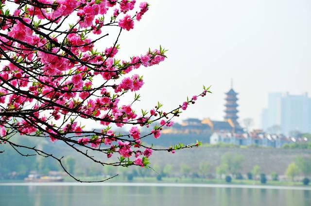 过长桥首先来到菱洲,一树桃花映白塔,堤畔水田似乡村。