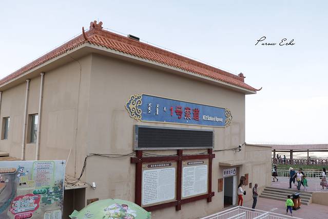 先从购票处出口下台阶——乘坐免费的蓝色公交——乘坐1号缆车——到达响沙湾公共娱乐区域——乘坐小火车——悦沙岛