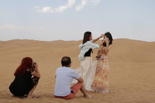 到达响沙湾,已经是中午11点,停车场收费10元(不限时)。姑娘们开始在车上化妆打扮,下车第一感觉:So hot!