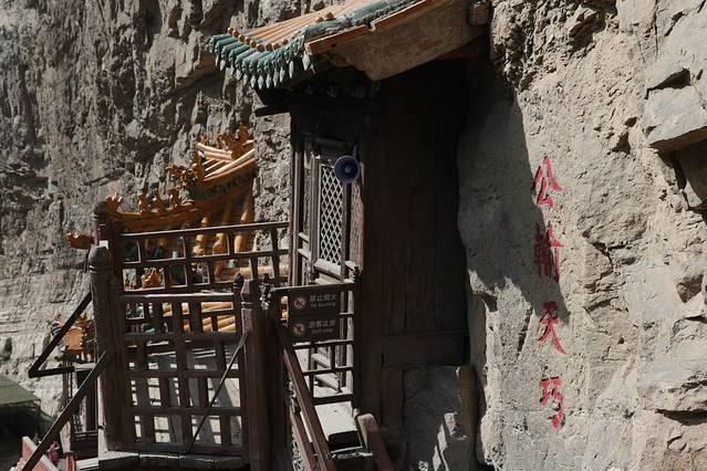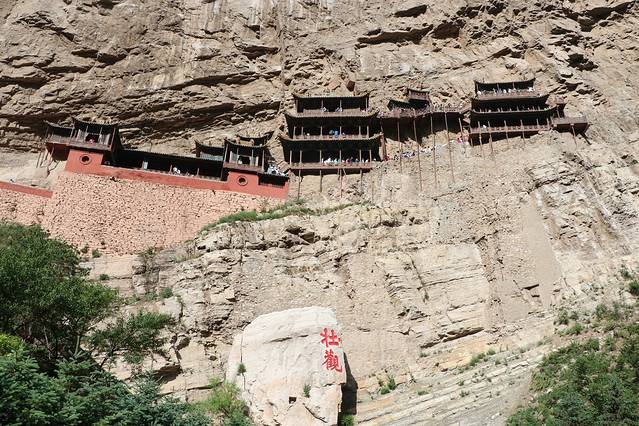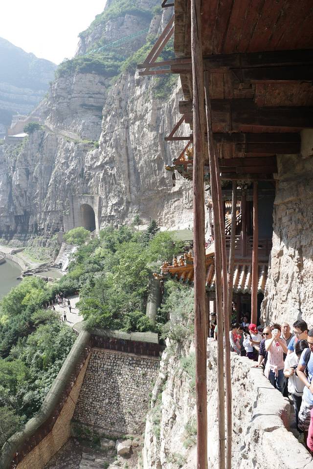 最险的一段就在画面中间。我们看到的那些外围柱子可以说只是摆设,给你一种心理上的安全感,其实它们很多都是不受力的。光看照片有人可能觉得不过而已,绵山也有类似建筑。但是,古人智慧厉害的地方在,整个寺为全木结构,靠半插横梁为基,上下一体,左右紧联。