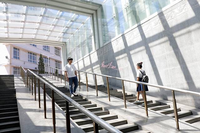 体育馆前,深情对视