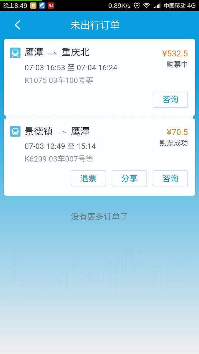 还傻傻的买了第2天的去重庆的火车票,因为我们这样想,万一洪水好了呢,可以去了。其实我们还做了2中打算万一去不了重庆呢。我们就商量去哪里,之后我就去长沙,湖北武汉,福建厦门,江苏南京等等。。然后我们商量了很久决定去厦门,还在网上买了去厦门的票 。就这样等待第2天的到来。然后我们早上去火车站看并问了工作人员发现不能去重庆。我们崩溃了。