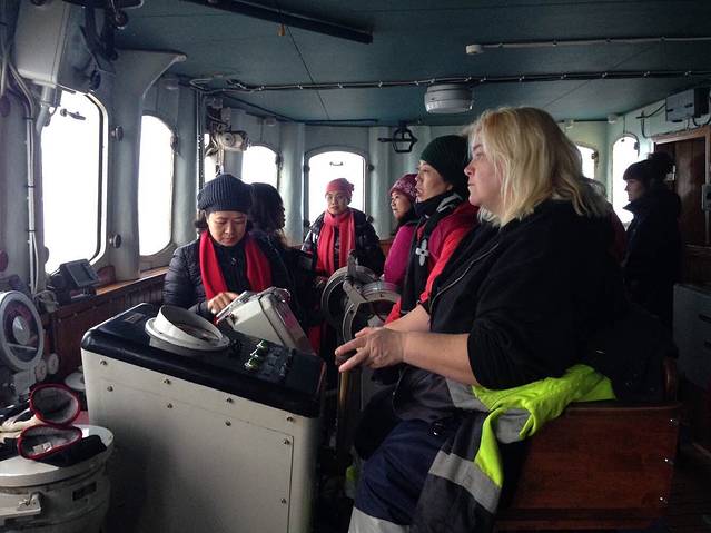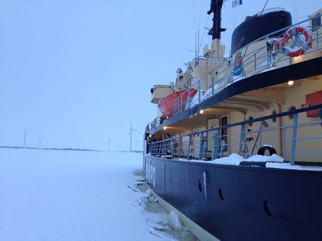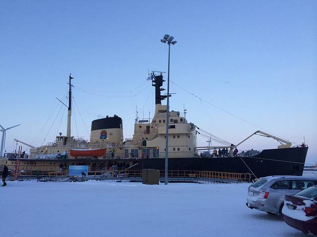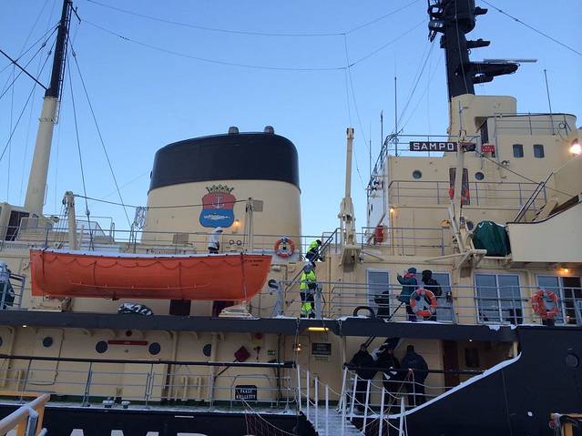 每天都有刺激和精彩!今天是Sampo破冰船和大海漂浮!登陆破冰船,全体工作人员列队欢迎我们!非常nice的工作人员,开船的女士,船长和他的帽子,和其他船只厚度对比的钢板样板,破冰能力达到80-120厘米