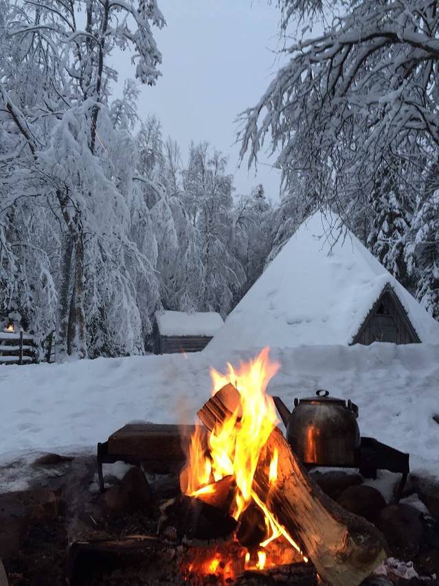 第一次见到这么厚厚的积雪的我们都兴奋不已……雪松都被压弯了腰,房子也带上了白雪帽子,透过篝火望去的远处依然清冷,雌雄和雄性的驯鹿都有鹿角,而且每年都会脱角,只是脱落的时间不一样,这个可怜的出苦力的家伙估计是个哥哥!