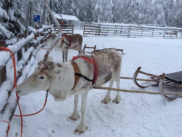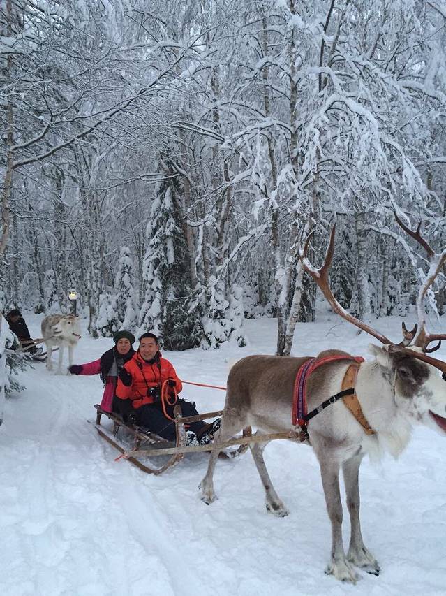 早上参观了驯鹿场,驯鹿拉着我们在树林中疯狂的穿梭,坐在前面的我,被鹿蹄子甩过来的雪搞的水流满面......