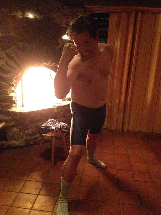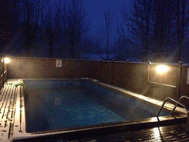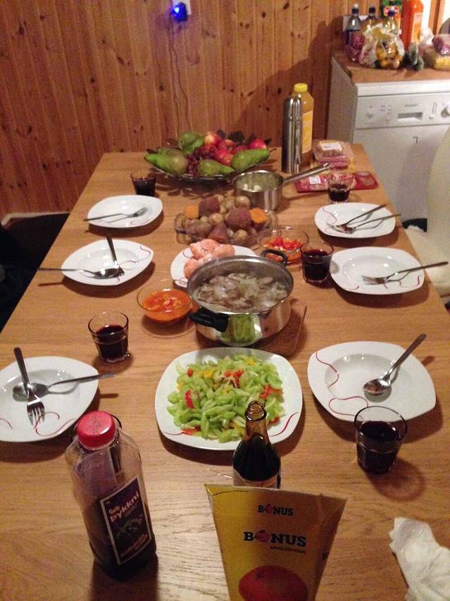 晚上入住了隐蔽在白雪之中的豪华木屋,主人和狗都很热情的欢迎了我们,最值得盛赞的是主人自己的温泉水特供的游泳池,能干的姐姐们准备了一桌子美味的菜贩,大家一起吃着喝着迎接2015年的到来。