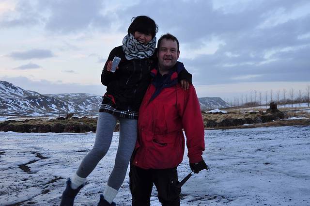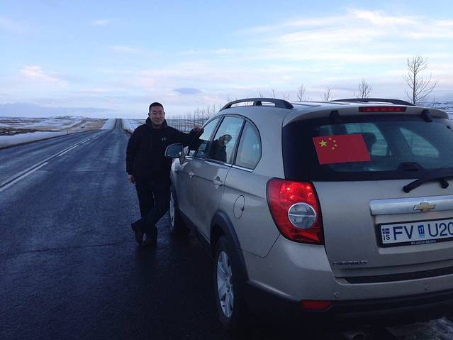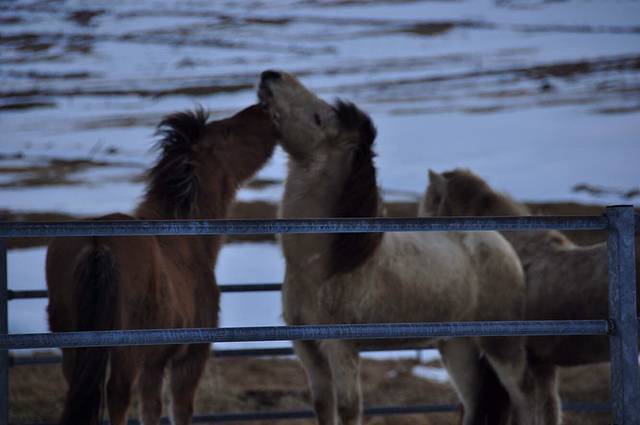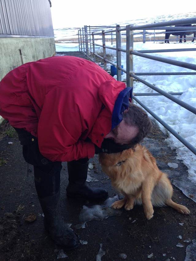 我们被一个热情的马场主人邀请参观马场,他还非常绅士专业的讲解了冰岛马的特点,这种和蒙古马同源,在冰岛已经生活了1100年的,世界上最纯种的、因为穿了厚厚的马毛衫可以整个冬天都生活在户外的、体型虽小,力量却惊人,是维京人可以依靠的伙伴。有爱心的主人有4条狗和3只猫,担心我们害怕的他居然把自己的头放进狗狗的嘴巴里让我们放心,最后,他居然一手把我举了起来,自豪的证明自己是北欧海盗的后代!
