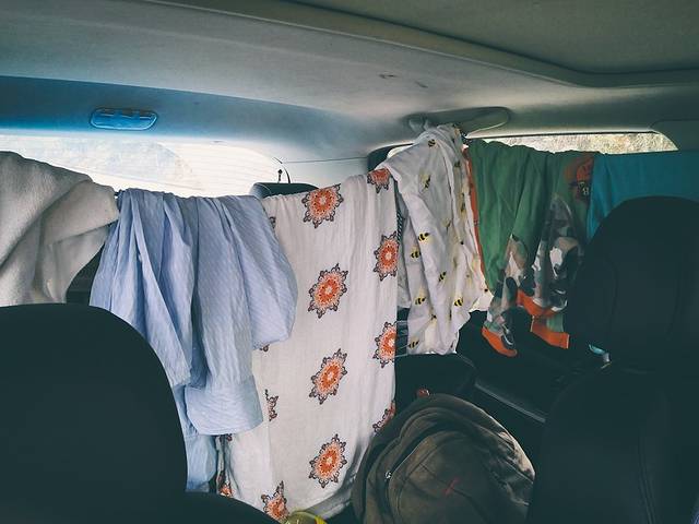 这种快十月的时节,居然晚上还有蚊子,早上起来天气依然阴蒙蒙的下着细雨,衣服已经几天都没有干了,稚嫩用电吹风吹,以前一个人旅行的时候电吹风吹衣服很快,现在一家人的衣服这么吹吹吹真是个大工程,尤其是男人的衣服又厚又大,所以所以这一路我们时常是这样晾衣服的,见下图