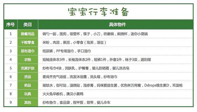 1、母乳宝宝,孩子带着妈就行(奶妈比较辛苦就是了),奶粉宝宝可能还要准备奶粉,奶瓶,保温杯等用品,可根据自己娃的情况做相应的增减哦