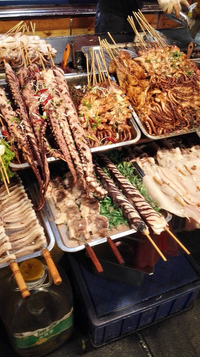 青岛四方路的小食,绝对高大上,吃货朝圣之地。新鲜鱿鱼才七元一斤,许多贝类五元。