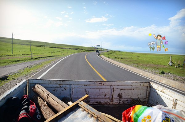 格格,这次搭个皮卡车,前往茶卡方向!由于里面坐满了人,我和格格坐在后边。