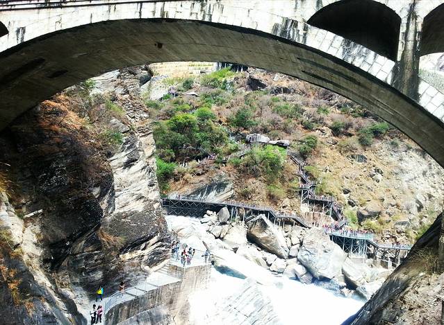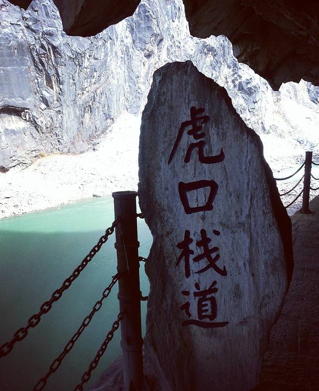 虎口栈道,去往虎跳峡的必经之路。铁链之下是逐渐变得湍急的江水。水面的风景,由倒映的蓝天白云,逐渐变成因为激流而泛白的水花。
