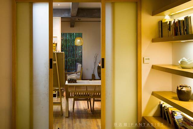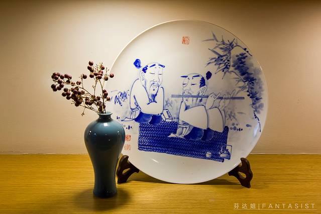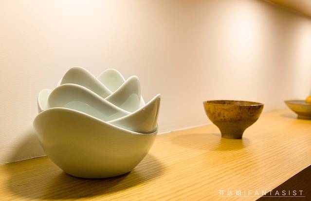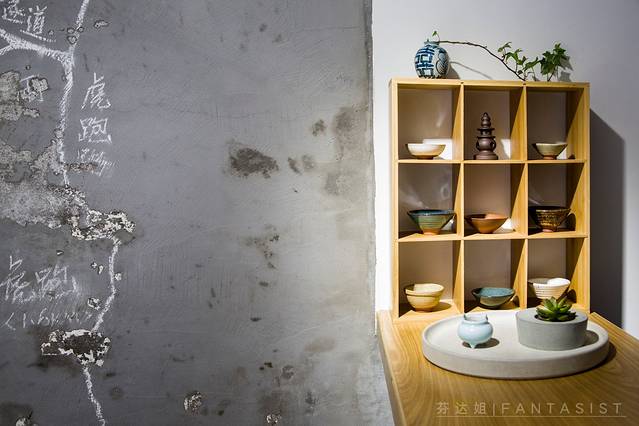 陈列架上面各种瓷器和书籍展示都让人觉得很舒适。