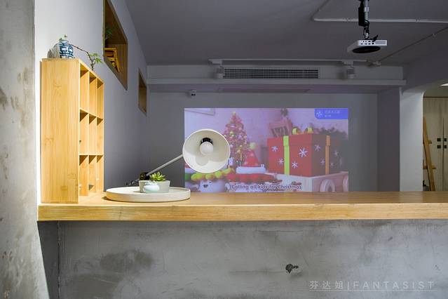 一楼是个小工作室的感觉,投影仪播放着儿童歌曲,没错,就是老板家的小公子正在晨间活动。