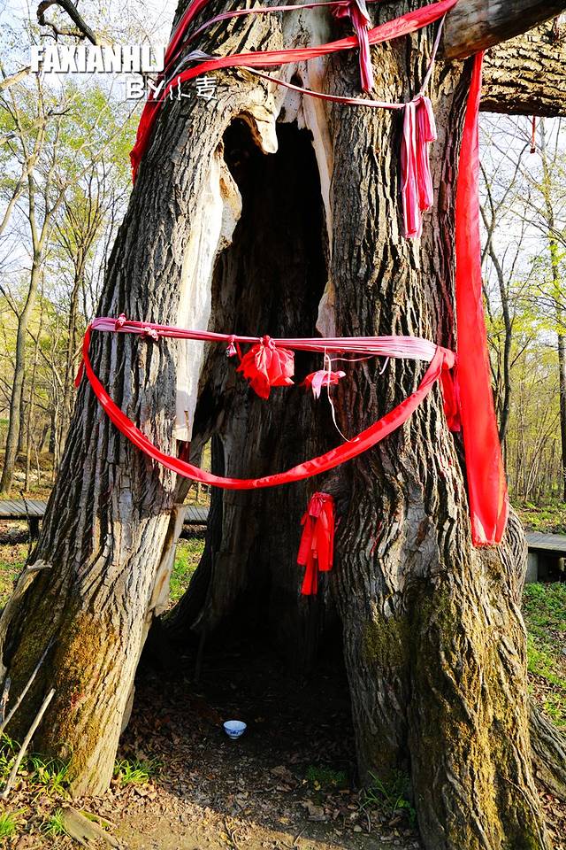 第一个到达的景点是凤树。这是一棵大青杨树,长于唐朝,距今有1300年历史,是黑龙江省目前发现年龄最老的古树,5个成年人手牵手方可抱住。古老的树上挂满了红绳,也挂着人们一个个愿望,一颗颗祈愿的心!