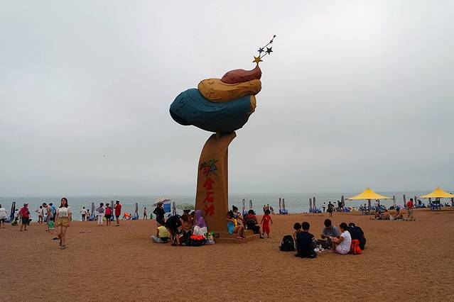坐返程观光车时路过了黄金海岸,犹豫再三还是决定下车上前一览那天天气很好,很多人在海里游泳哦,风景很漂亮,唯一遗憾的是沙子并不是很细腻的那种,而是掺杂了很多小石子,踩下去挺咯脚的。还有让我和老妈看了半天都没认出来是什么物种的金石滩标志…