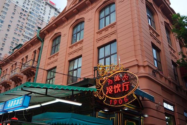 非常显眼的马迭尔冷饮厅,门口那一溜的长队啊~