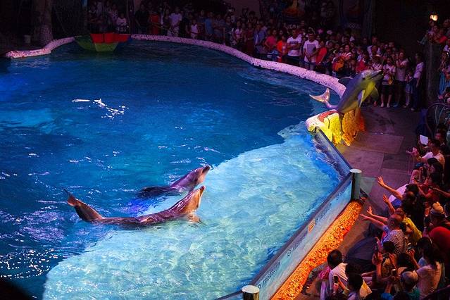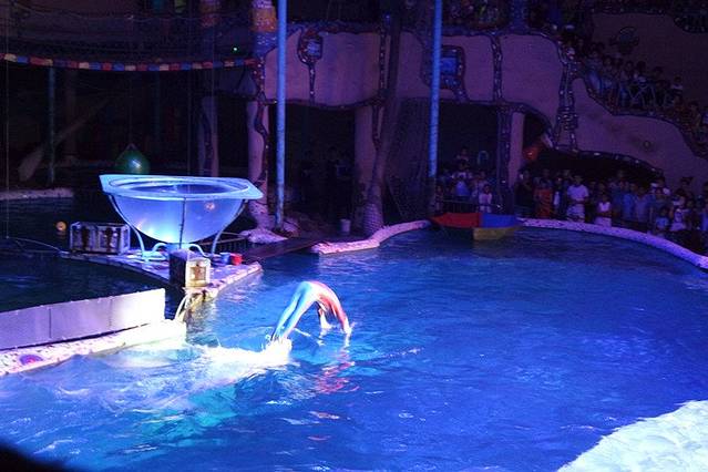这场海豚湾之恋的表演场地是最大的,还带剧情~表演的很精彩,而且演员也会和观众互动,前排还特意标注了‘湿身区’hhh,两只海豚太可爱了