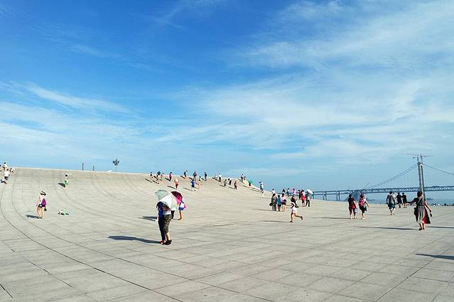 看完恐龙馆出来就走到星海广场上,不得不说雨后大连的天空真的太美了,湛蓝湛蓝的。 星海广场上人也很多,尤其在天书上面,各种摆造型拍照的人们呐~我和老妈也尝试了一下往上爬,一开始还行,但突然到某一个点就会觉得特别滑,完全要摔倒的感觉…无比佩服那些站在最高点的人,甚至还有些人干脆一屁股坐地上自由滑行了安全起见我们就没有继续尝试,拍了几张照片就去旁边逛咯~