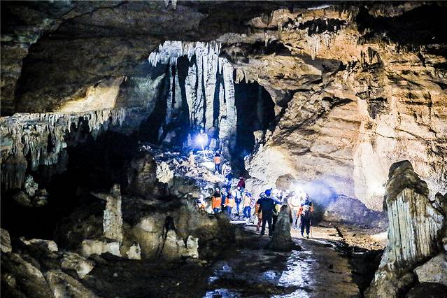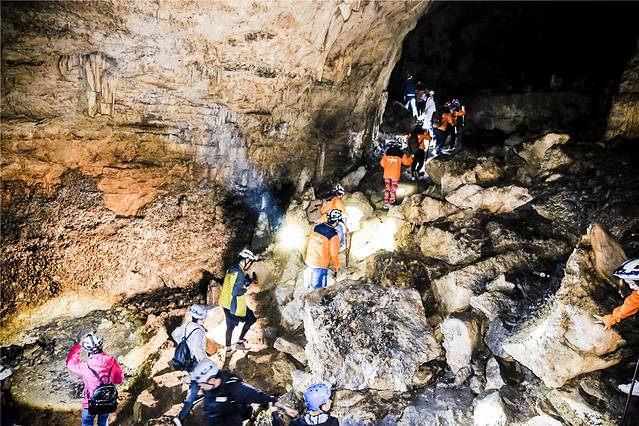 洞穴里面还是有些湿冷的,洞内景观琳琅满目、流金溢彩,囊括了世界上所有溶洞的堆积形态和类别;地面风光湖泊峡谷、箱状大峡谷、无坑、天生桥、天窗、石芽、峰丛等别具特色,令人叹为观止。