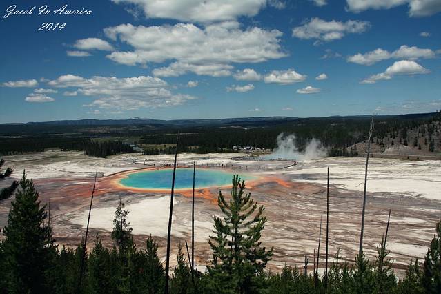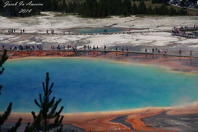 大稜镜温泉位于黄石国家公园的大稜镜温泉(The Grand Prismatic Spring,又称大虹彩温泉),是美国最大,世界第三大的温泉。它宽约75至91米,49米深,每分钟大约会涌出2000公升,温度为71°C左右的地下水。