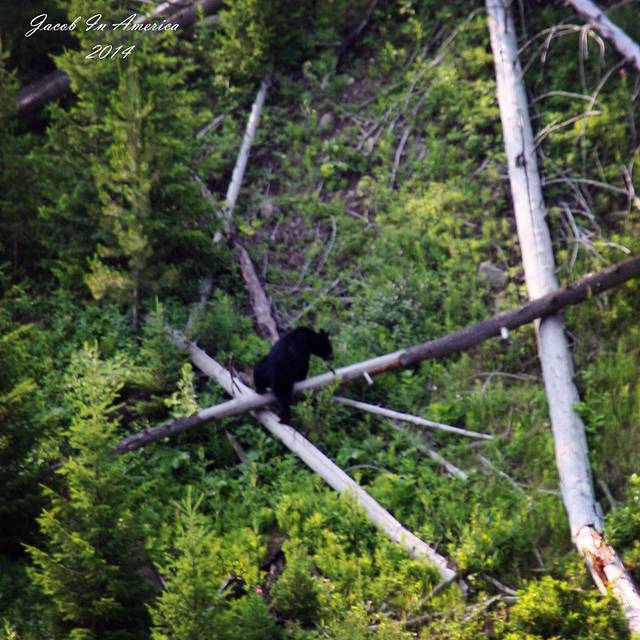 从东线出发进入黄石湖区和罗斯福区。在黄石的野生动物很多都在早上5、6点的时候最为活跃,很多野生动物摄影家们甚至会在野外蹲点几天几夜,就为了拍摄到一些难得的野生动物的镜头。的确不如很多野生动物爱好者们这么虔诚,不过在路边还是遇到了黑熊,虽然住在狼区,还是没有遇到野狼和狐狸,根据最近年来的数据显示,黄石的野狼和狐狸越来越少,而且随着黄石的游人逐渐增多,它们更是远离一些靠近公路的区域活动,所以要是在黄石能看到狼和狐狸是很难得的事情。