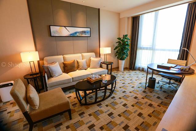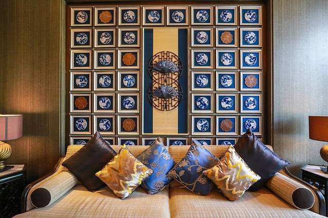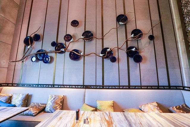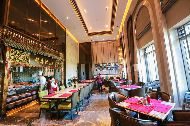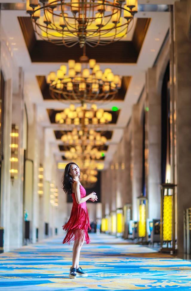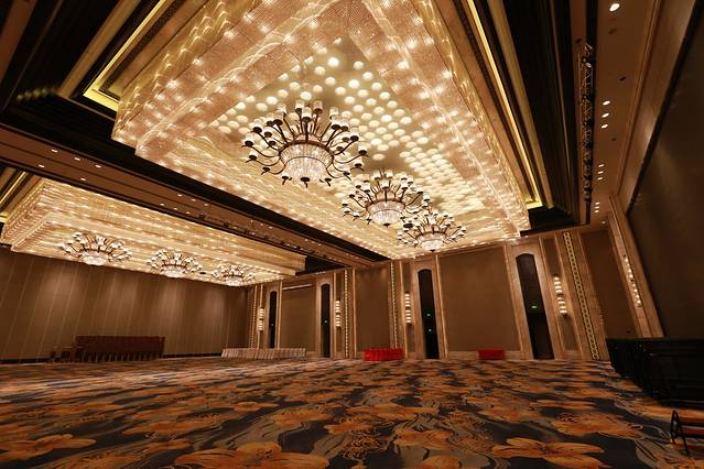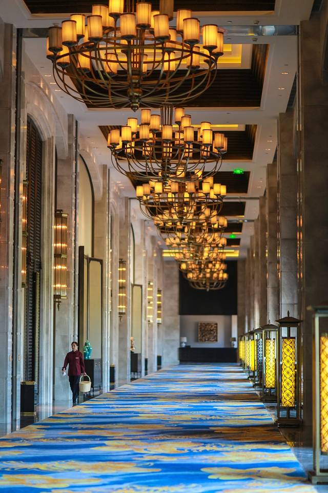 特别喜欢的是宴会厅旁的走道,欧式高吊顶,蓝玉兰花地毯,毗邻九龙湖旁,很有形式美感
