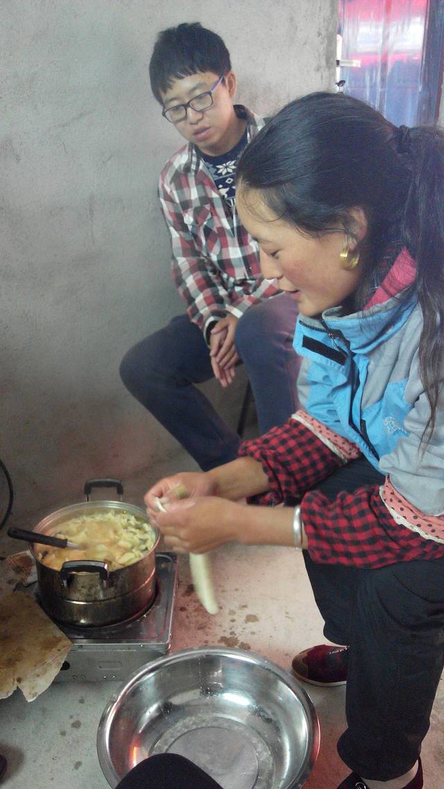 还叫上我们一起吃晚饭,老板是一对年轻的藏族夫妇,心地善良有热情,还让我在他们的洗车间搭帐篷,至少有个屋顶,不至于在外面淋雨,我们也正好在那里等我们另个一小伙伴上来与我们会和。我们决定三个不分开了,不然,另一个,真的是有些惨。