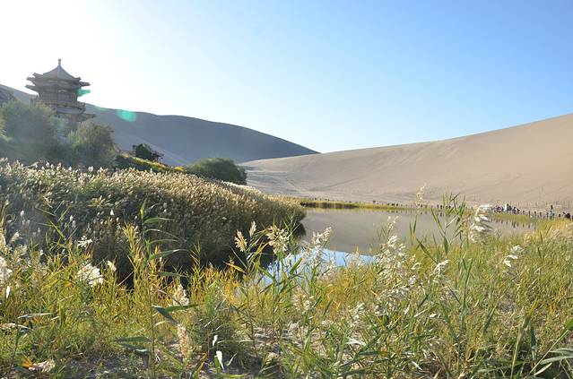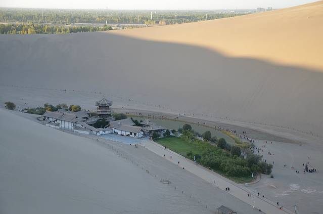 月牙泉在山上拍的。月牙泉最好爬到山上才能拍到全景。