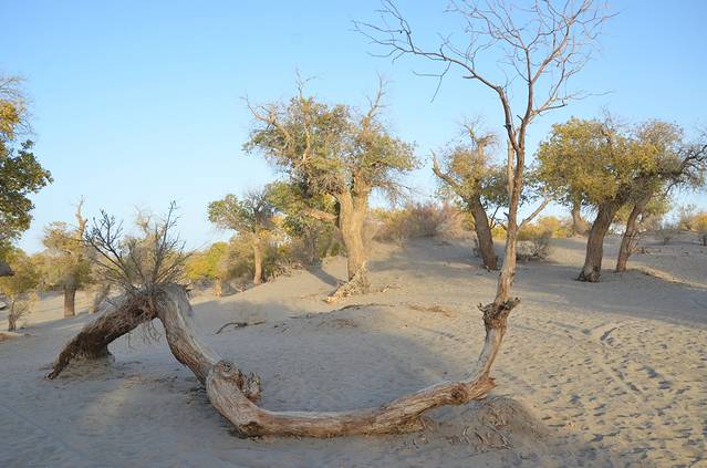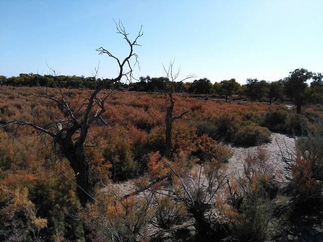 早晨6点多到景区看日出。策克口岸买了一条狐狸毛皮围巾、吃了内蒙烤羊肉串。下午去了怪树林,没啥看的。