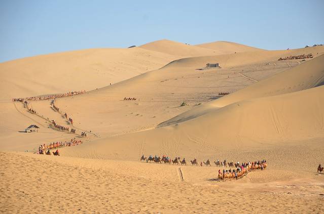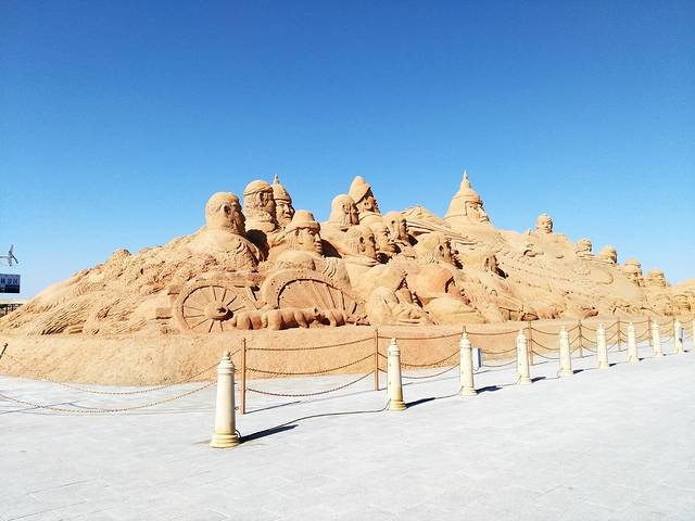 进到景区要坐船到对岸的沙丘上,在船上可以欣赏沙湖风光。坐船15分钟,在沙滩游玩2小时,景区里免费供应开水,是我见到的第一个景区供应开水的地方。回程在另一个码头坐船,下船乘电瓶车到景区广场一边,步行到停车场要15分钟。