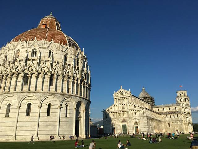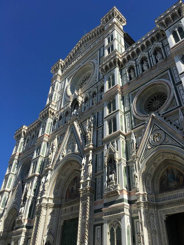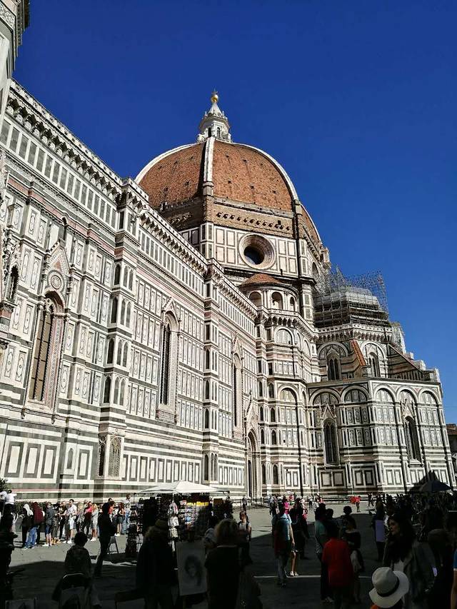 看到百花大教堂的时候,内心相当震撼,也许是因为第一次看到这样的建筑,也许是她真的是很美,很雄伟的原因,我跟我的小伙伴们都惊呆了,开启了疯狂照相模式。圣母百花大教堂是世界五大教堂之一,徐志摩把它译作“翡冷翠”, 教堂位于意大利佛罗伦萨历史中心城区,教堂建筑群由大教堂、钟塔与洗礼堂构成。它的特别之处在于,它是使用天然白、红、绿三色花岗岩贴面的美丽教堂,将文艺复兴时代所推崇的古典、优雅、自由诠释得淋漓尽致,因此被命名为“花之圣母”。根据导游介绍,圆顶的设计师布鲁涅内斯基没有画一张草图,也没有写下一组计算数据,仿佛整座圆顶已经在心里建好了。这就是我们的第一站,拍拍照,走走看看时间就到了。