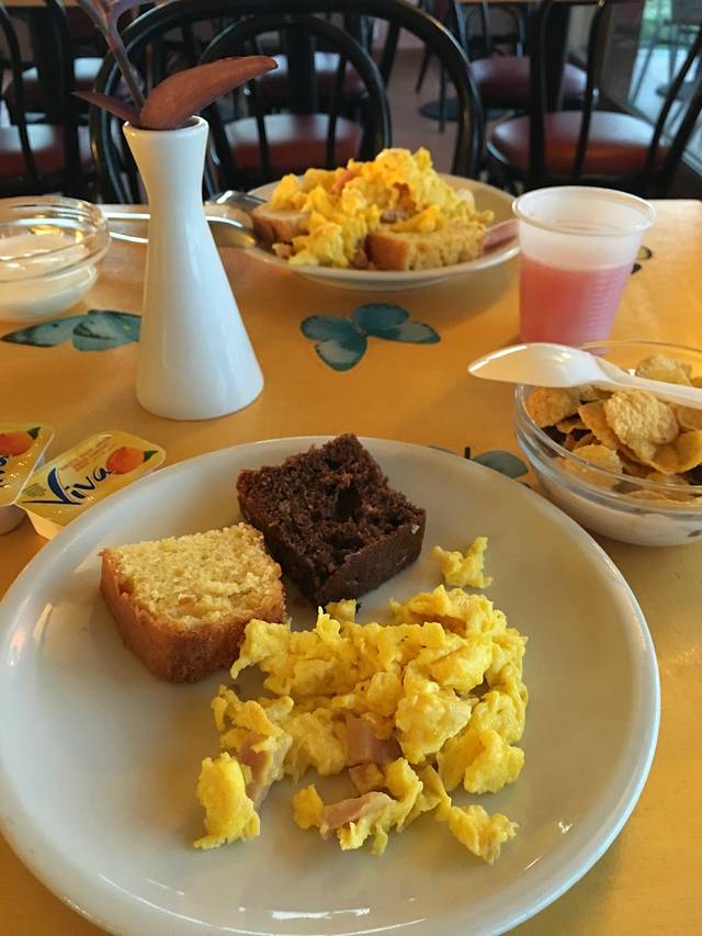 这个面包很好吃,软软酥酥的,夹心巧克力。 右边这个蛋糕是咸的,虾蟹味道,说实话真吃不惯,但是一路上我们为了显示不浪费 不被外国人瞧不起的眼神,一般拿的不多,取了必吃完…… 在欧洲,很讨厌别人浪费,而且大多少早上的面包都是一人一个,没有多余