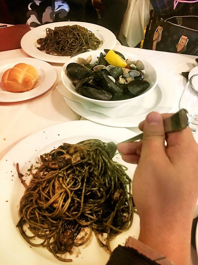 三小时觉得人太多,我们就去吃了当地的墨鱼面,比起导游给的价格,这个价格简直就是超级便宜,吃的嘴巴黑乎乎的,就是意大利面加墨鱼酱料,有点咸,老公吃的那一碗海鲜不太啊好吃……