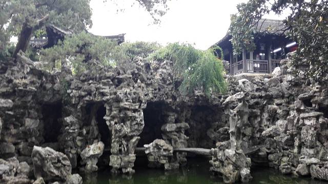 湖石假山(银山):用玲珑剔透的太湖石叠成。山前有池水,山下有洞室,水上有曲梁。洞室可以穿行,拾级登山,数转而达山顶。