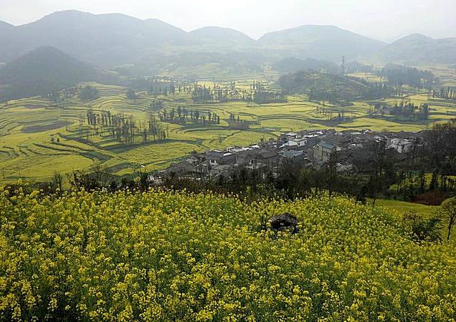 虽然油菜花的花形并不美,单独的一花一朵并没什么可看,但是到了花季,成畦成片的金黄色漫开来,覆盖着田野、村庄和房屋,让人领略到高原花海的万种风情,把你的心情,把你的思绪,把你的梦想,都染得金灿灿的。