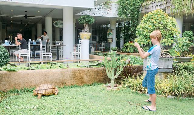 全程都入住在这一家度假村内,地理位置很好,酒店的后门穿过马路就是卡伦海滩,有5个大泳池,7-19点开放。度假村延续了东南亚的风格,好像一座秘密花园,植物围绕,各种动物会出没,兔子、巨型乌龟、鹦鹉、鸽子(早上会来抢你早餐吃!)、鸡,当然也有壁虎这样的小动物,只能说非常原生态啦。酒店入口到大堂有一段比较长的路要走。
