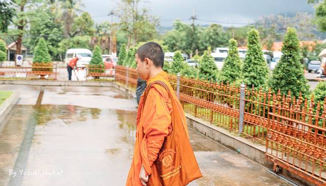 总有小僧侣出现在这里,穿着橘色的僧袍,背着橘色的布袋,和一行人匆匆走在雨里,因为怕衣服被水塘里的水溅到,时不时的,提起衣角,快速走过。这样的画面在泰国太多见,不敢去评论他们的人生,但起码从他们脸上看到的是生活的从容和心满意足。