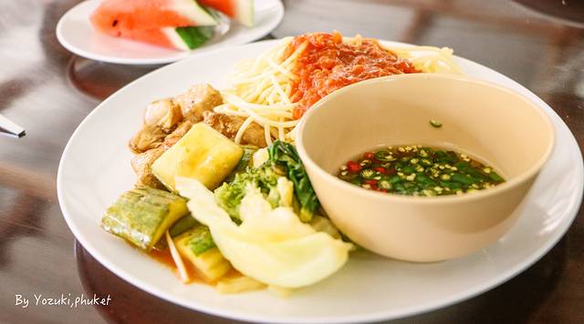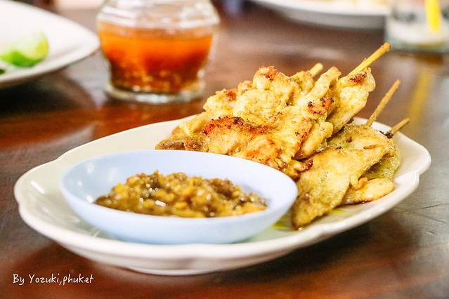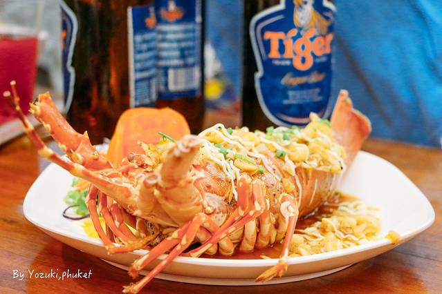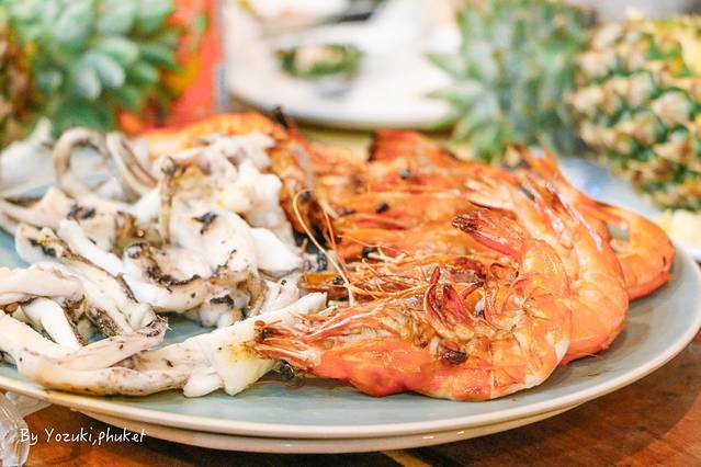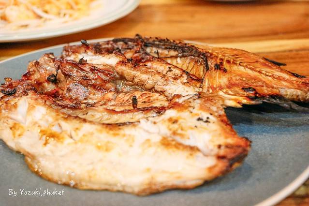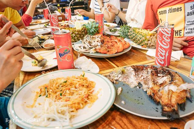 晚上回到酒店附近,沿着卡伦海滩的主路找寻吃饭的点,这一片还是挺热闹的,经过一片餐厅聚集的地方,很多泰国小哥用不太流利的中文在招呼,我们选择在一家吃当地菜和烧烤的地方坐下。无非点一些菠萝饭、炒米粉之类,另外点了烤鱼,鱼香四溢,肉很香嫩,也没有什么小刺,超级好吃!