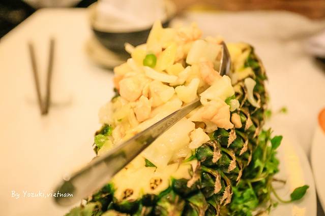 晚上找到一家具有中式环境的餐厅,餐厅有包厢,名字都用极其优美的中文成语命名。点了菠萝饭、鸡块等,味道还可以,消费不便宜,可以说是此次之行最贵的一顿,因为还要收相应的服务费。想着反正也是在越南的最后一顿,吃饱就好。
