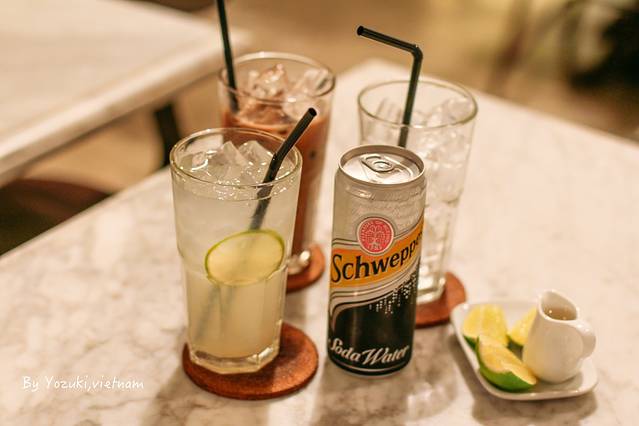 柠檬苏打水,会给一杯满满的冰块,一碟柠檬片和糖水,还有一罐苏打水,喝的时候,把苏打水倒入冰块里,按照自己口味加糖加柠檬汁就可。无疑是消暑的最佳饮品,夏天,就是适合来一杯气十足的饮料!