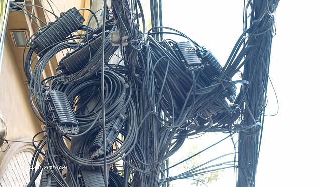 在胡志明市,只要你一抬头,经常可以看见这种错综复杂的电线缠绕在一起,很佩服把这些电线安置上去的人,更佩服那些在后期去修理这些电线的人。