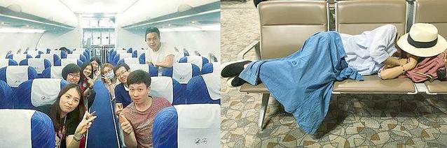 左图为转机的小伙伴在经历航班取消、延误后,成功“包机”,右图为选择直飞的我航班持续延误,最终在机场过夜,因为据说飞往普吉岛的一段中有暴雨。其他航班也都纷纷延误,不过天气原因谁也无法改变,大家的焦虑渐渐都平息下来,不少人都选择补给食物后平躺下来,静候广播的通知。