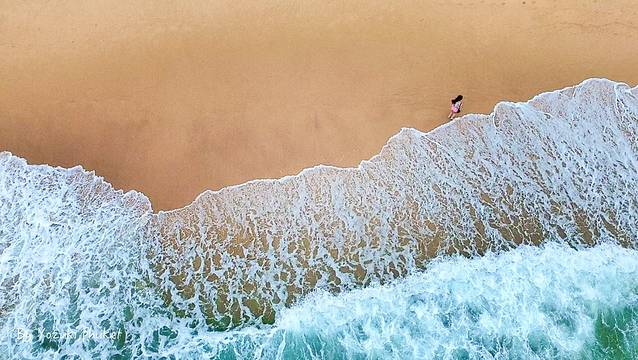 世界之大,独我一人。在海的面前,显得如此渺小,心中不由得感叹大自然。看着这张照片,想到了著名摄影师拍的一张婚纱照,新娘躺在海滩上,以海水为婚纱尾裙,彷佛同身上穿的婚纱混为一体,美极了。等到某一天,希望自己也能拥有这样的相片。