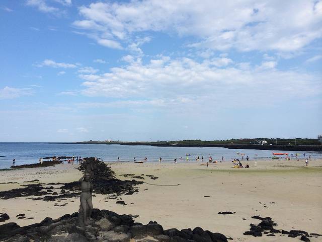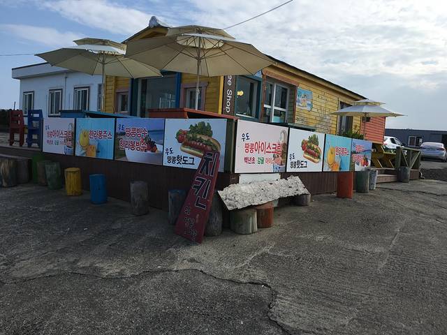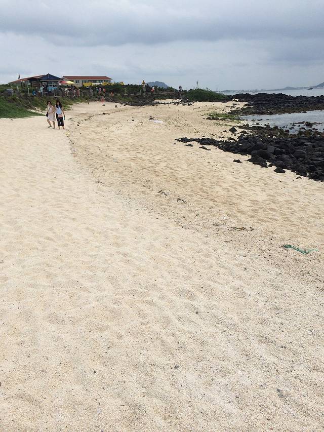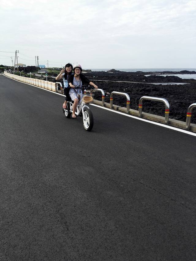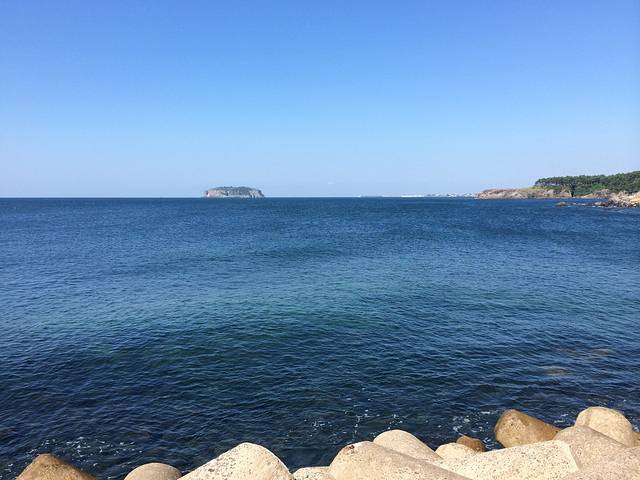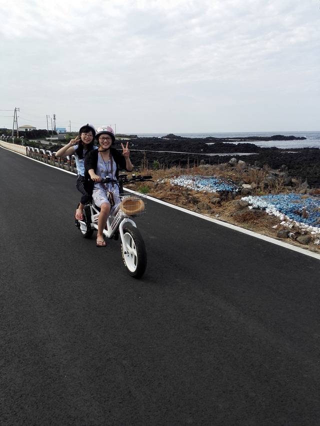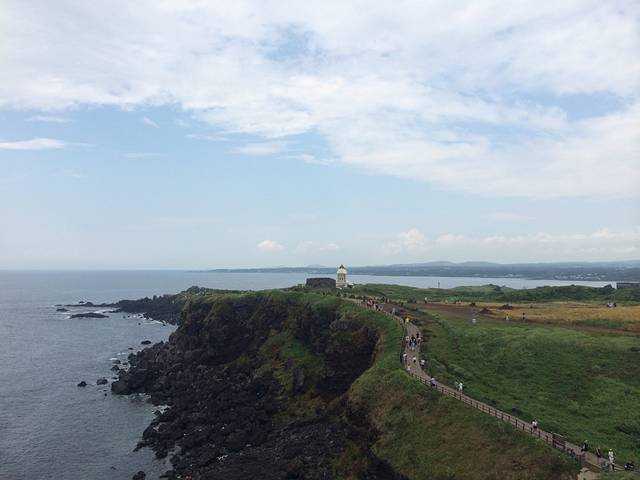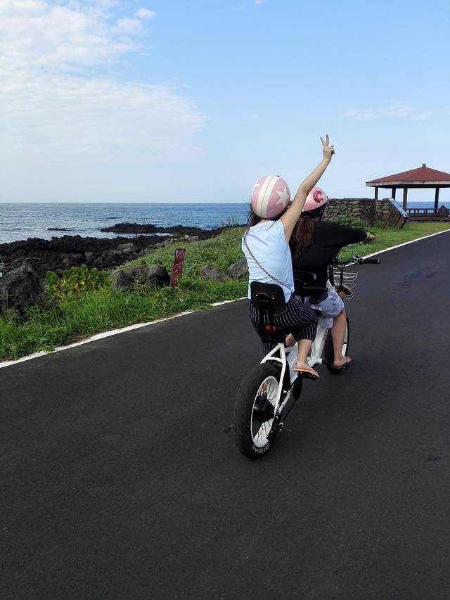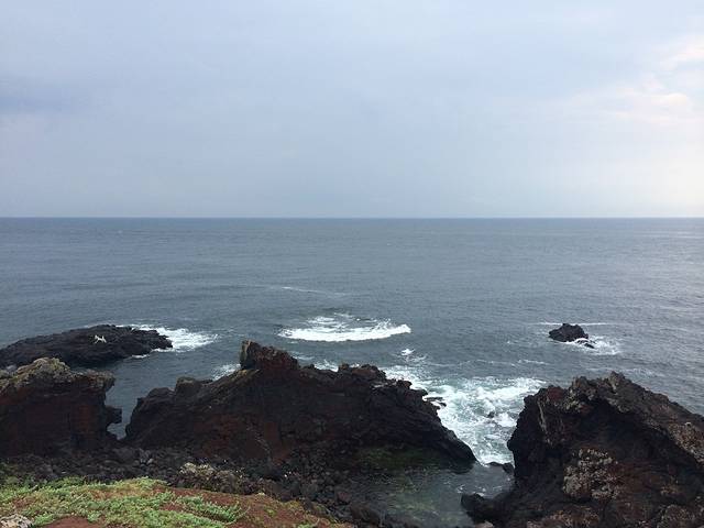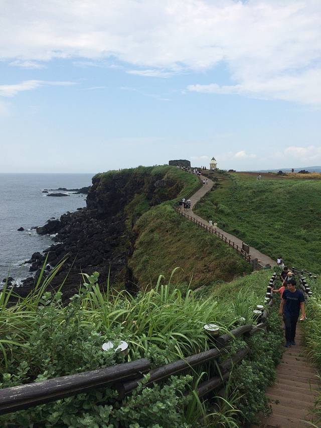第四站,牛岛。包车师傅带我们去买票,坐船去岛上。一会儿雨停了,空气非常好,很舒适。不像之前太热不适合室外。坐船到岛上后已经不早了,地图找之前看好的吃的店,应该都可以,或者直接附近哪家人多口味就应该不错。韩国吃饭消费不低,比国内高,三四个人点个套餐加米饭就行了,或者点个面啥的。我们吃的鱼套餐。吃完海边转转,有沙滩,捡了几块黑石头回来,济州岛特色,海水很凉。之后去租电瓶车环岛。价格不等,有上坡不建议自行车。也有公交车,嫌找站点麻烦,又想骑车,骑车会更有感觉。路上风景很不错,美爆了,到了一个景点处不好多逗留,快速转了一圈,要是时间充足可以慢慢玩。推荐指数五颗星。