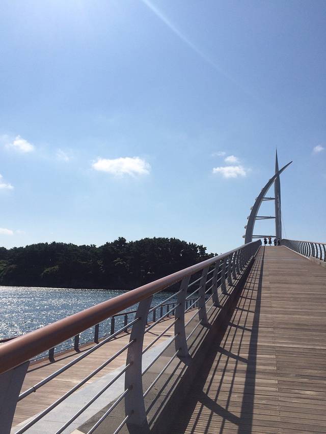 早上起床后去鸟岛新缘桥转了一圈,向下走,小篮球场旁彩色小路下去,不用往下走绕路。太阳很晒,旁边正房瀑布天帝渊瀑布都不想去了。桥附近风非常大,帽子都戴不住,拍了些照片,玩了会儿回酒店check out,作攻略有别的公交稍微快一点到济州市区,但是考虑到600站台离我们最近,就不折腾了,拖箱子走路还是很烦的。